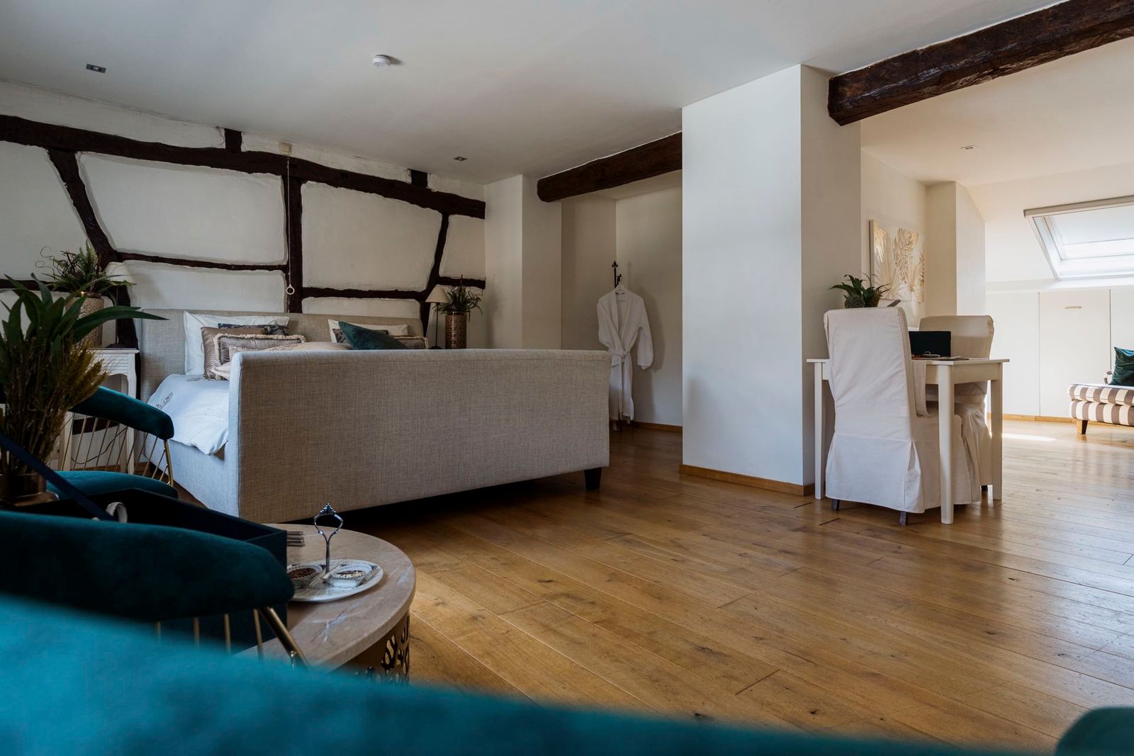 Suitekamer met aparte badkamer met toilet, ligbad en douche.